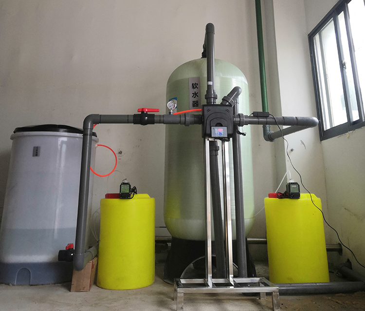 由于水的硬度主要由鈣、鎂形成及表示,故一般采用陽(yáng)離子交換樹(shù)脂(軟水器),將水中的Ca2+、Mg2+(形成水垢的主要成份)置換出來(lái),隨著樹(shù)脂內(nèi)Ca2+、Mg2+的增加,樹(shù)脂去除Ca2+、Mg2+的效能逐漸降低。