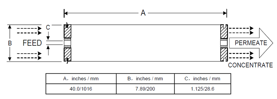 海德能PROC10抗污染反滲透膜元件尺寸(單位為:英寸(毫米)):