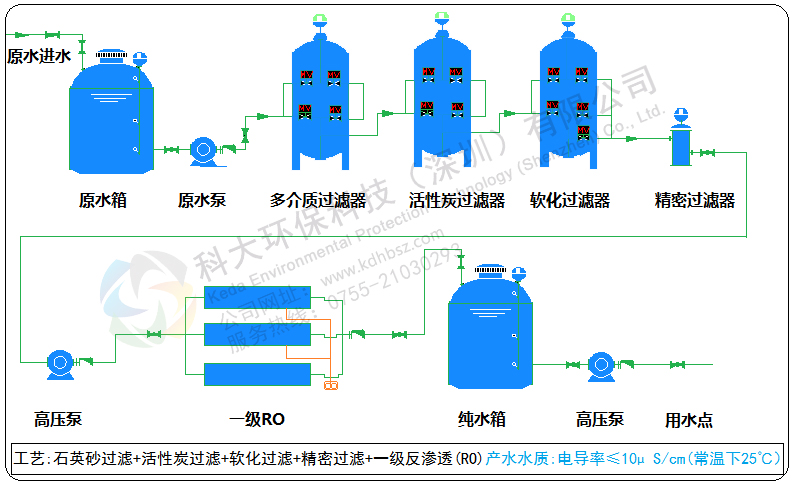 反滲透純水設備_采用預處理、RO膜反滲透技術、edi模塊或拋光混床等工藝相結合制取符合標準純水的工業純水裝置,出水水質達到各行業工業用水標準;RO膜的反滲透技術也是當今最先進、最有效、最節能的膜分離技術,根據客戶的需求采用的不同的工藝流程來制取符合客戶生產用純水的標準;總的來說科大環保純水設備共有5大優點: